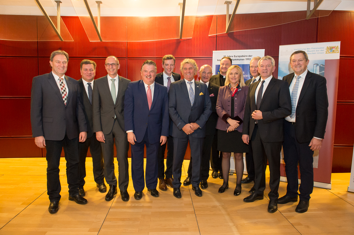 Zu diesem Anlass luden die Bayerische Staatsministerin für Europaangelegenheiten und regionale Beziehungen, Frau Dr. Beate Merk, gemeinsam mit den Präsidenten und Vorsitzenden der Trägerverbände des Europabüros – Dr. Uwe Brandl, Dr. Kurt Gribl, Christian Bernreiter, Josef Mederer und Gerhard Jauernig – in die Brüsseler Vertretung des Freistaats Bayern. Über 250 hochrangige Gäste, darunter Abgeordnete des Europäischen Parlaments, Vertreter der EU-Kommission und mehrere große Delegationen bayerischer Kommunalpolitiker, folgten der Einladung. Als Gastredner sprachen der EVP-Fraktionsvorsitzende Manfred Weber, der Richter des Bundesverfassungsgerichts Prof. Dr. Peter M. Huber und EU-Kommissar Günther H. Oettinger. Die Abendveranstaltung stand unter dem Motto „25 Jahre Europabüro der bayerischen Kommunen – Beitrag der Kommunen bei der Gestaltung Europas“.